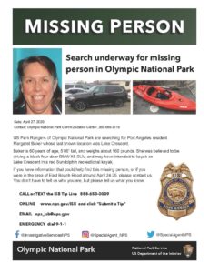 Baker was reported missing by a family member after being unable to contact her. Park Rangers were notified the vehicle was located and a hasty search began at Lake Crescent.