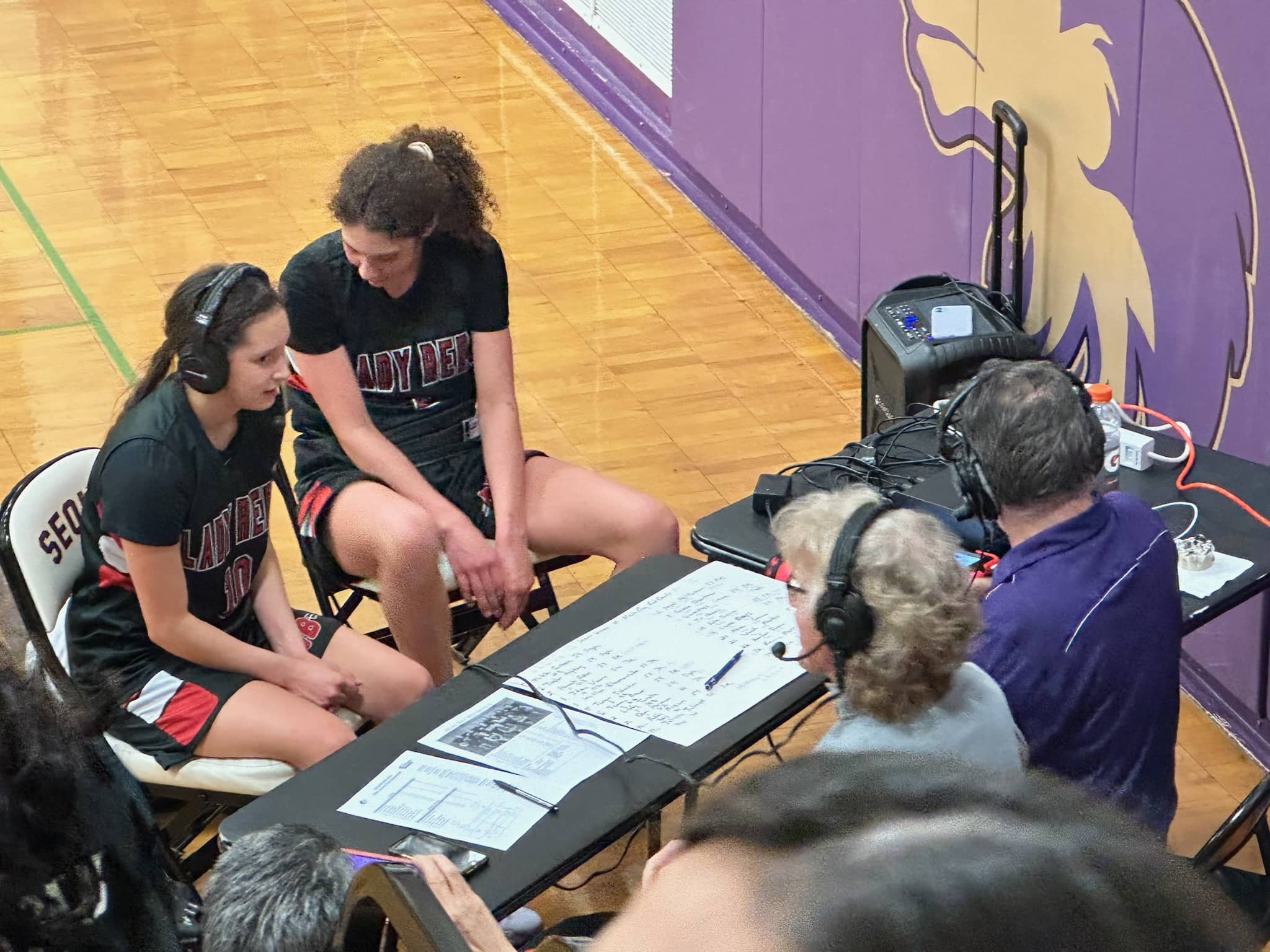 Red Devils Allie Greene and Angel Halttunen on last year’s KONP Newsradio Post Game show after beating Sequim by 15