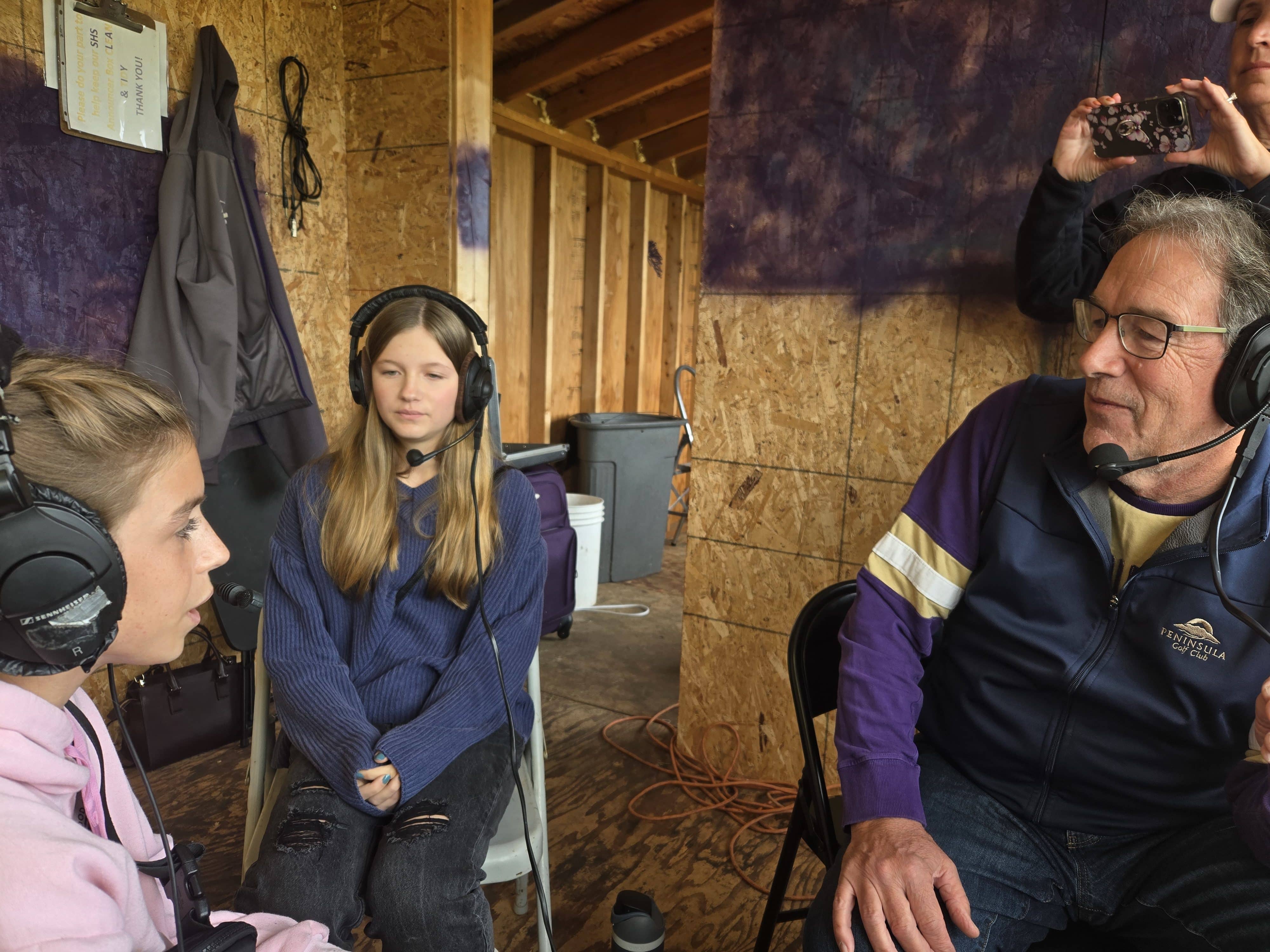 KONP sports radio commentator Greg Thomas interviewed 7th graders Emily Bair and Arwen Osbourne of the Sequim Wolf Pups Championship Cross Country team at halftime of the Sequim football game on Saturday.