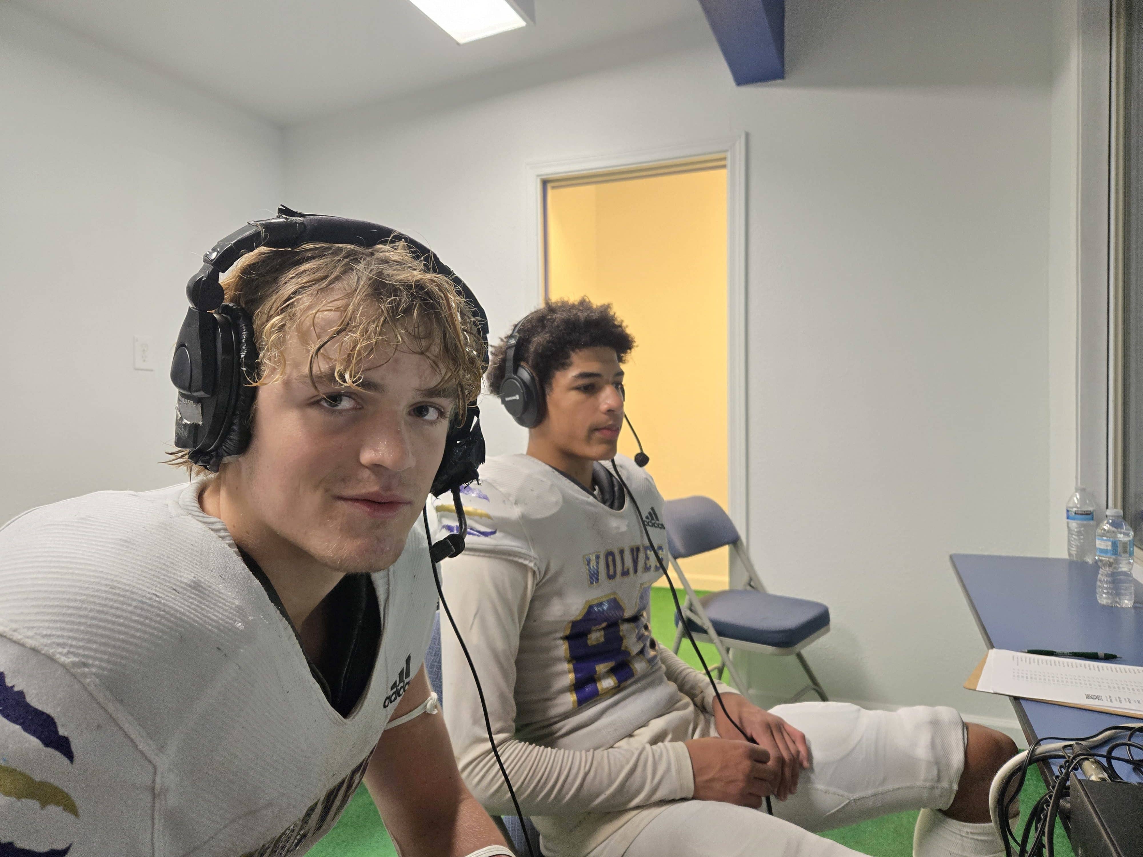 Sequim Wolves quarterback Zeke Schmadeke (left) and Solomon Sheppard appeared on the KONP Newsradio post-game show following the Wolves’ 35-7 win over North Mason.
