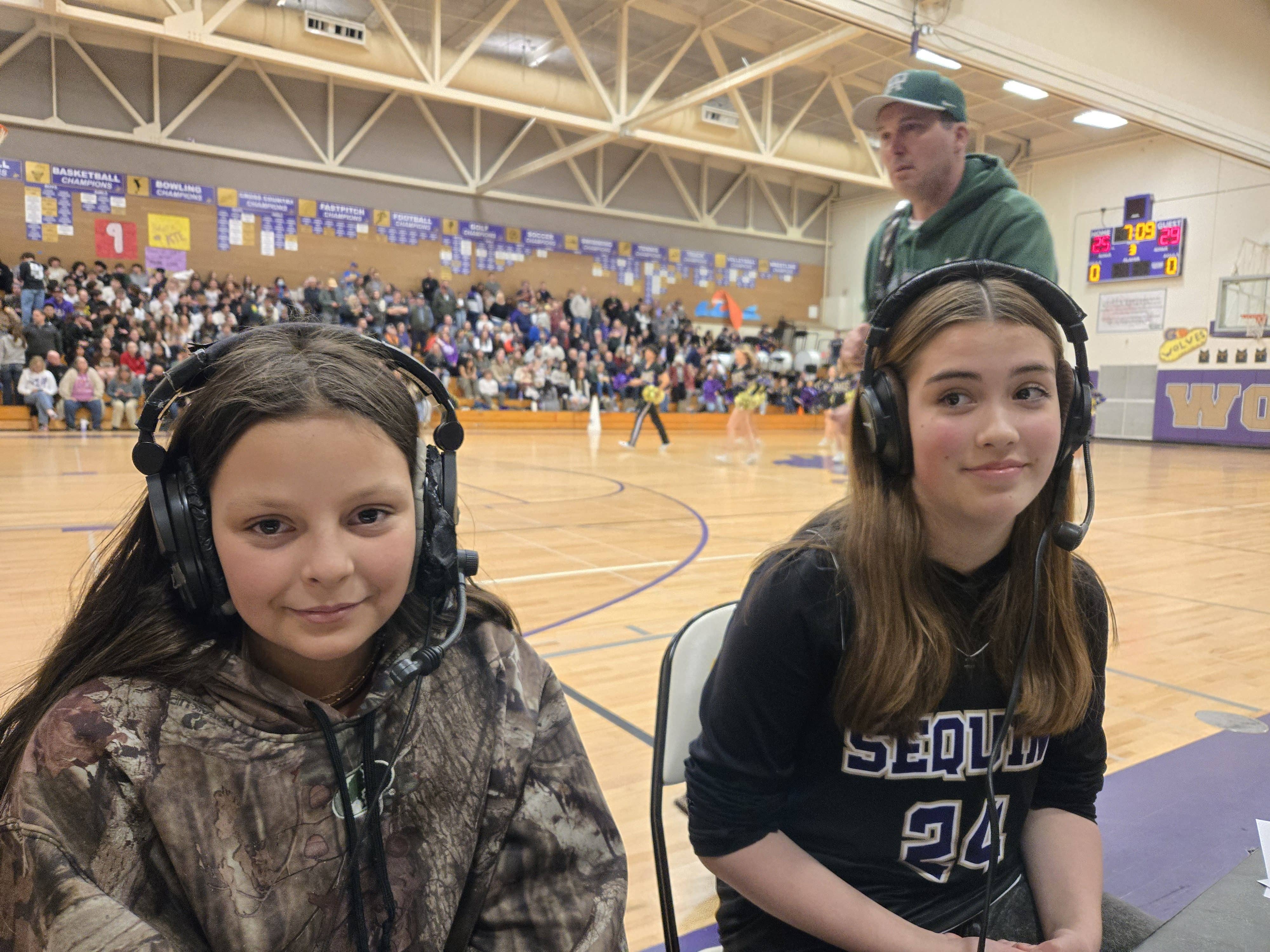 Fifth-grader Ashtyn Messinger and sixth-grader Angelica Iott, seen here on the KONP Newsradio VIP Halftime Show, are members of the Sequim Wolf Pups travel basketball team. Their team is heading to watch the Washington vs. 16th-ranked Maryland game on Sunday