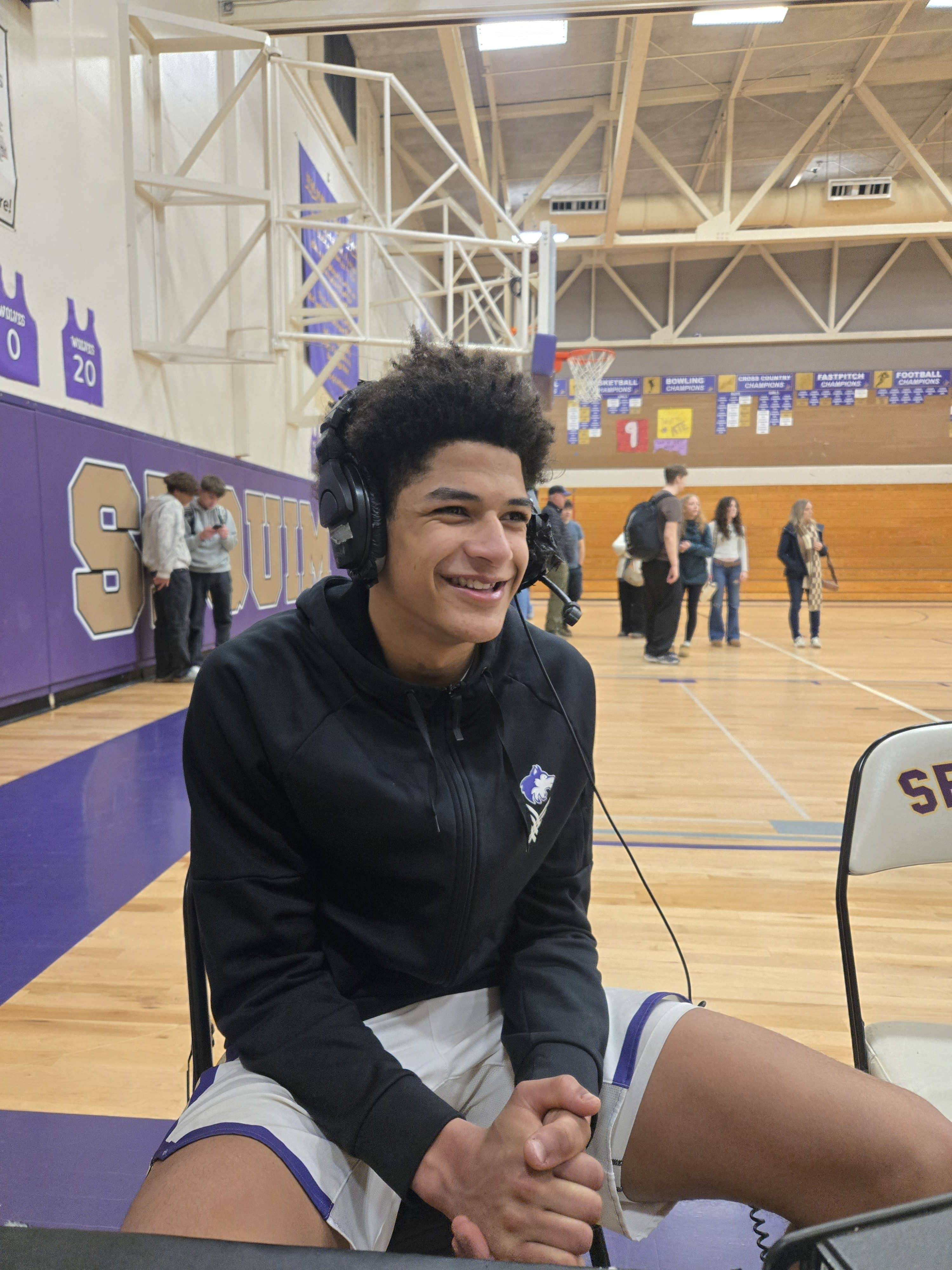 Wolves Jr Solomon Sheppard had a big smile on his face on the KONP Newsradio post game show after hitting for 15 points and and a thundering slam dunk near the end of the game as the Wolves are Olympic league Co – Champs.