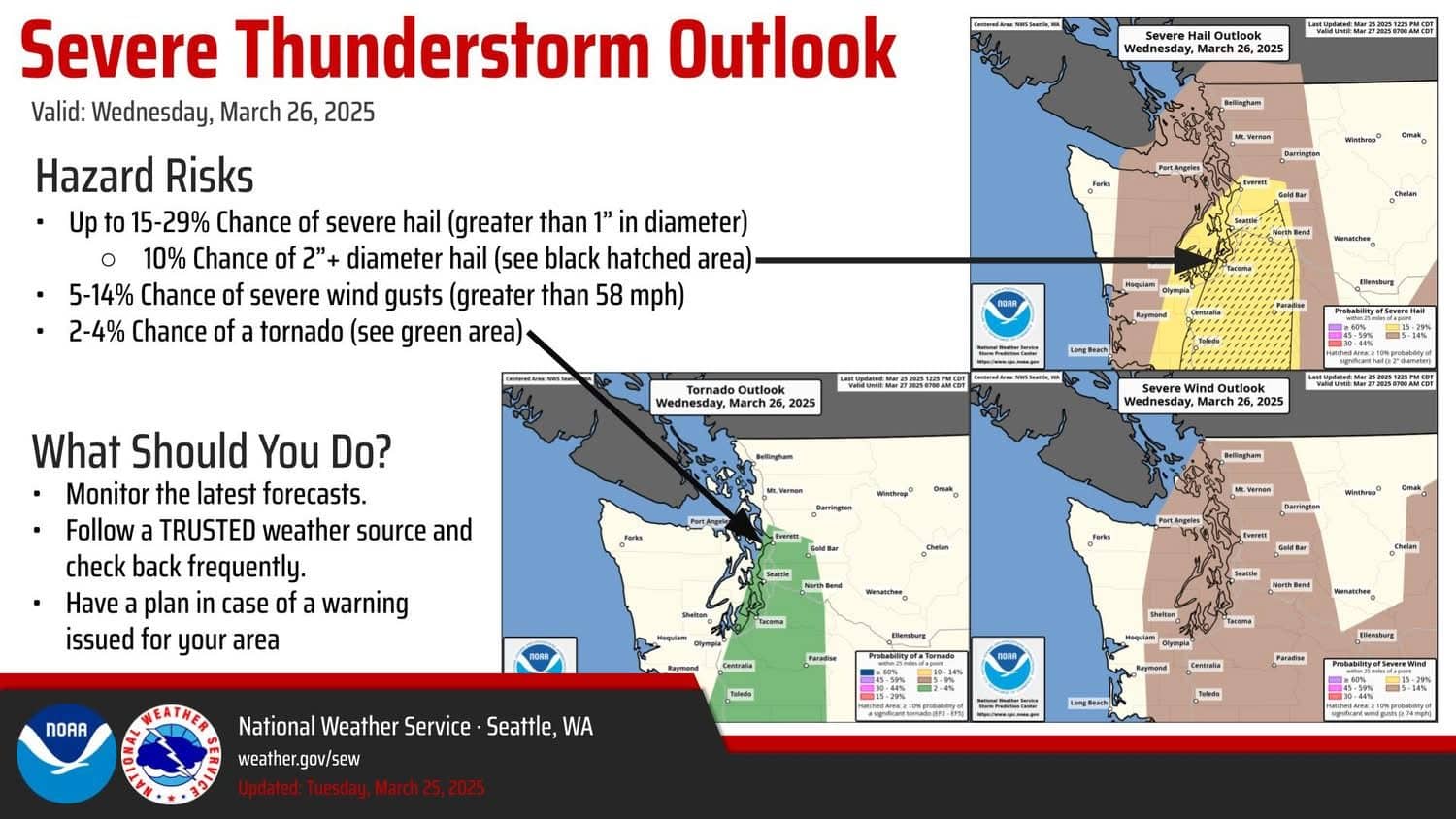 The National Weather Service forecasts a 30-50% chance of thunderstorms, with the primary threats being hail and strong winds. There is a 15-30% chance of severe hail (greater than 1 inch in diameter) and a lower probability (5-14%) of severe wind gusts exceeding 58 mph. The risk of a tornado is low but not zero for western Washington.