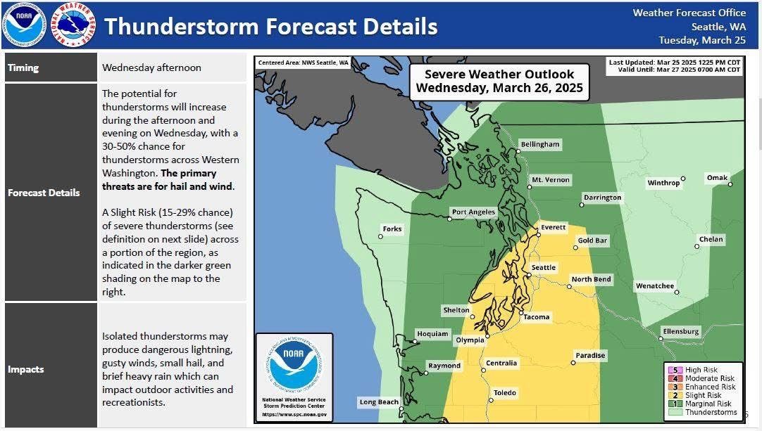 The National Weather Service forecasts a 30-50% chance of thunderstorms, with the primary threats being hail and strong winds. There is a 15-30% chance of severe hail (greater than 1 inch in diameter) and a lower probability (5-14%) of severe wind gusts exceeding 58 mph. The risk of a tornado is low but not zero for western Washington.