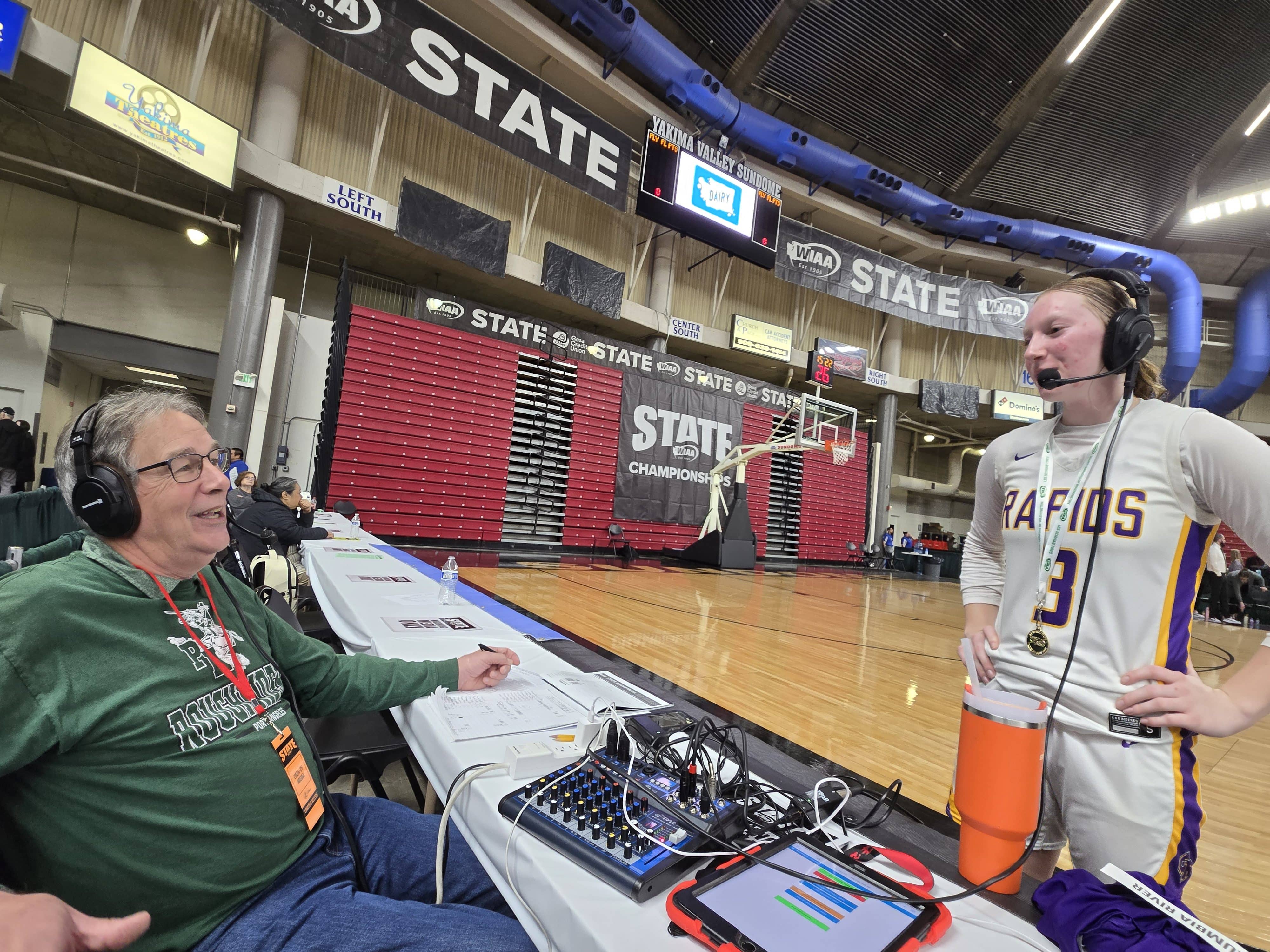 Marly Myers, seen here on the KONP Newsradio postgame show after leading her Columbia River Rapids past Port Angeles in the state tournament, has signed to play for Allison Crumb’s Peninsula Pirates.