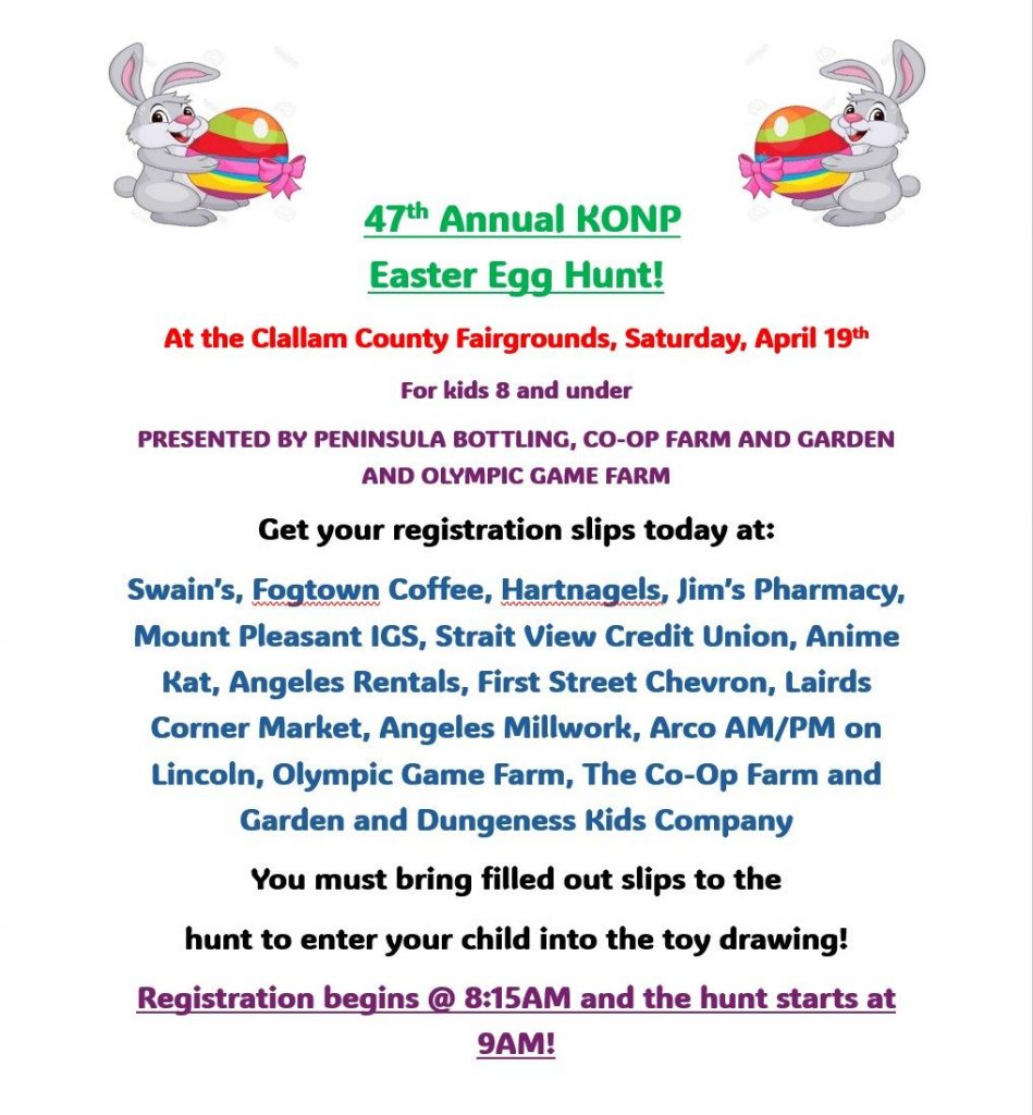HOP TO IT! The beloved KONP Easter Egg Hunt is back for its 47th year! This Saturday, April 19th, the Clallam County Fairgrounds will be sprinkled with eggs, laughter, and little feet as kids 8 and under dash for treasures. Registration begins at 8:15 and the Egg Hunt starts at 9:00AM SHARP!