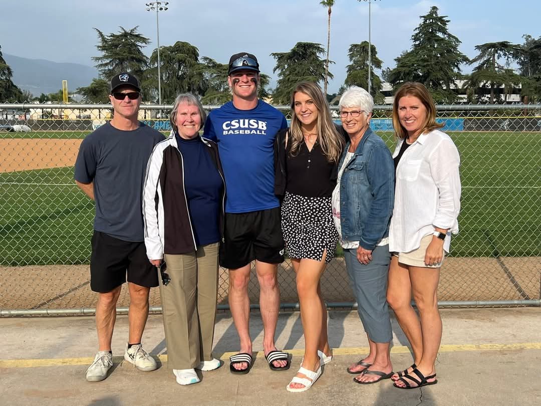 Family members of former Roughrider baseball star Wyatt Hall traveled to Cal State San Bernardino for his Senior Night. Left to right: father Ike Hall, grandmother Donna Hall, Wyatt Hall, sister Callie Hall, grandmother Cindy Pederson, and mother Amy Hall.