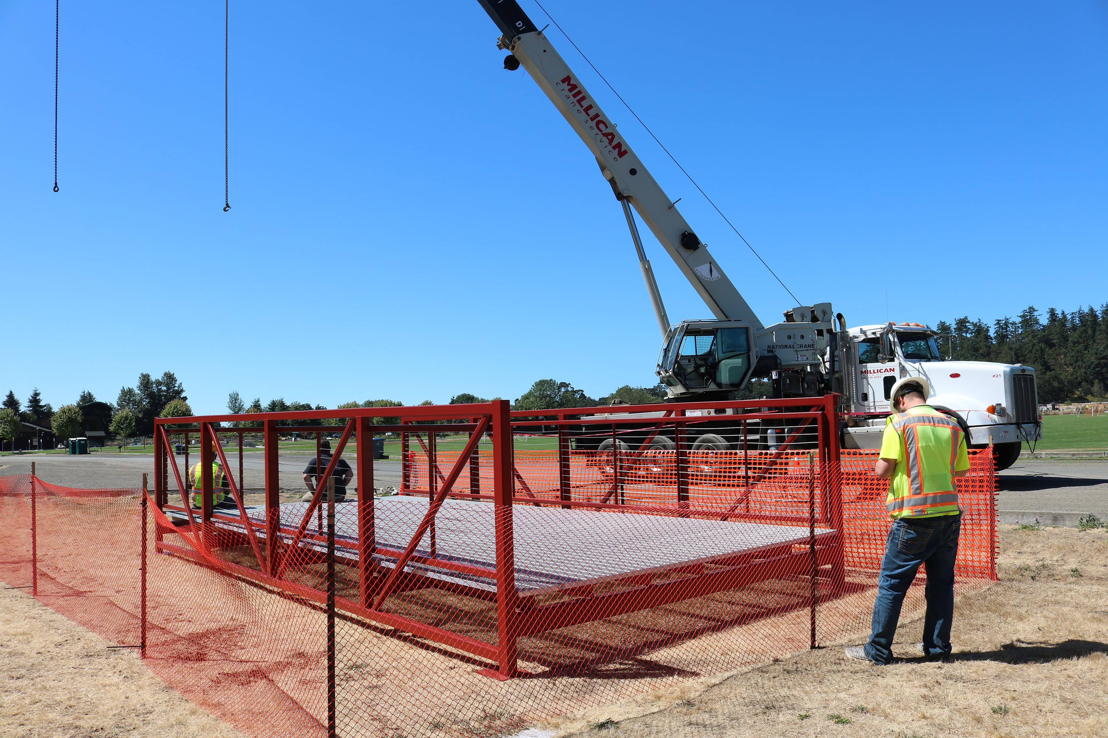 Work wrapped up recently following the delivery and installation of prefabricated steel bridges manufactured by Bridge Brothers. One bridge replaces the aging Olympic Discovery Trail span, while the second has been placed approximately 60 to 100 feet upstream of the shorter pedestrian bridge located southeast of the bandshell.