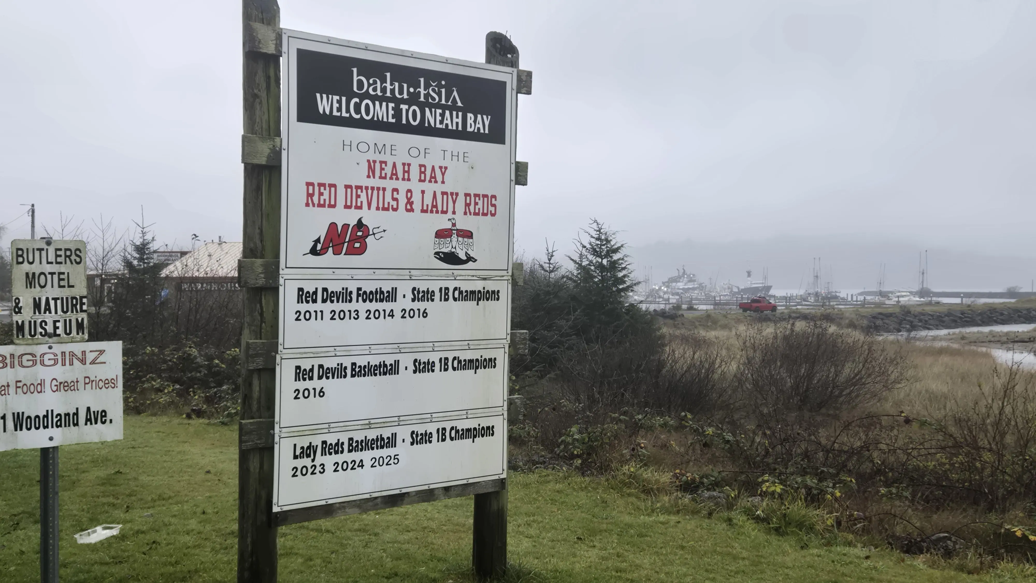 Visitors entering Neah Bay pass the Red Devils’ state championship sign, now displaying eight titles.