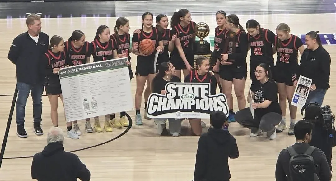 The Neah Bay Red Devils girls basketball team celebrates another state championship.