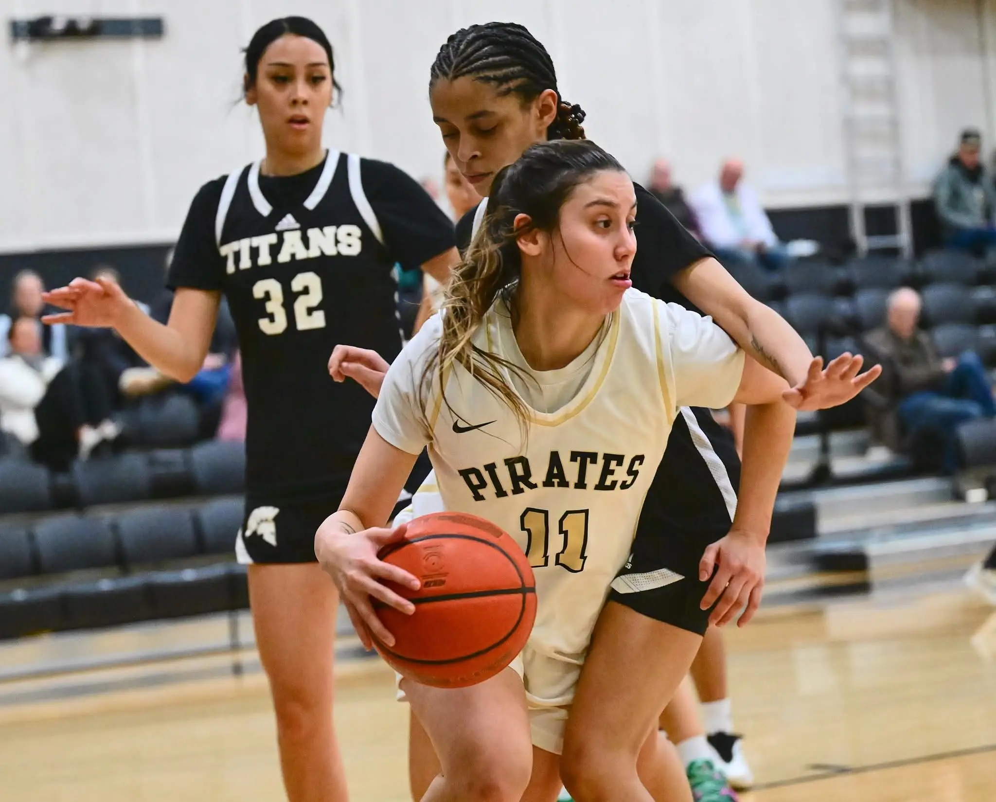 At the point, 5’6″ sophomore Carliese O’Brien of Bethel, Alaska, is the prototypical Alison Crumb floor general: quick, fast, and with excellent court vision. O’Brien sprained her ankle in game two and missed a pair of contests, but she’s back steering an offense scoring 64 points per game — even with the Pirates giving bench players extended minutes. She’s averaging 7 points, 5 assists, and 3 rebounds per game.