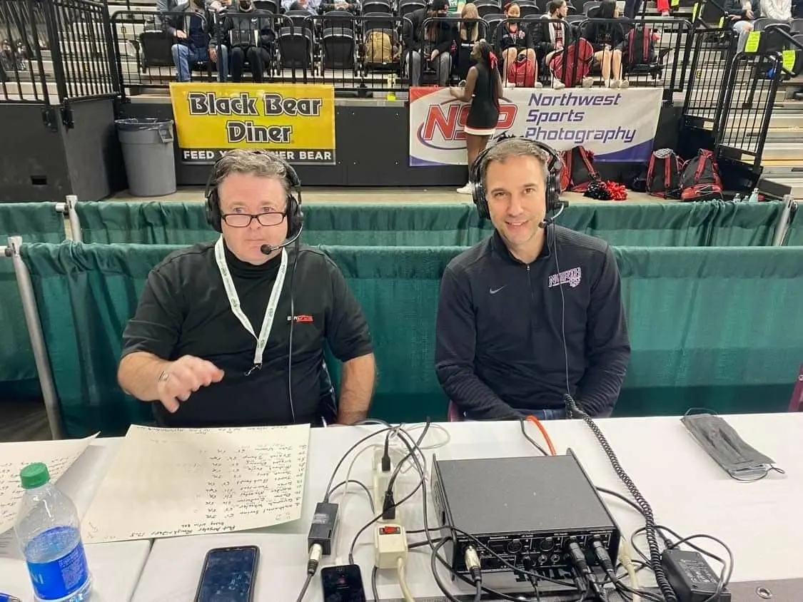 Former North Kitsap head coach Scott Orness, pictured with Oly Archibald during a Port Angeles–Franklin Pierce boys state tournament broadcast, is now the head coach at Bainbridge, replacing Will Harris, who has moved on to coach with USA Basketball. Orness’ son, Cade, is a freshman playing at Gonzaga.