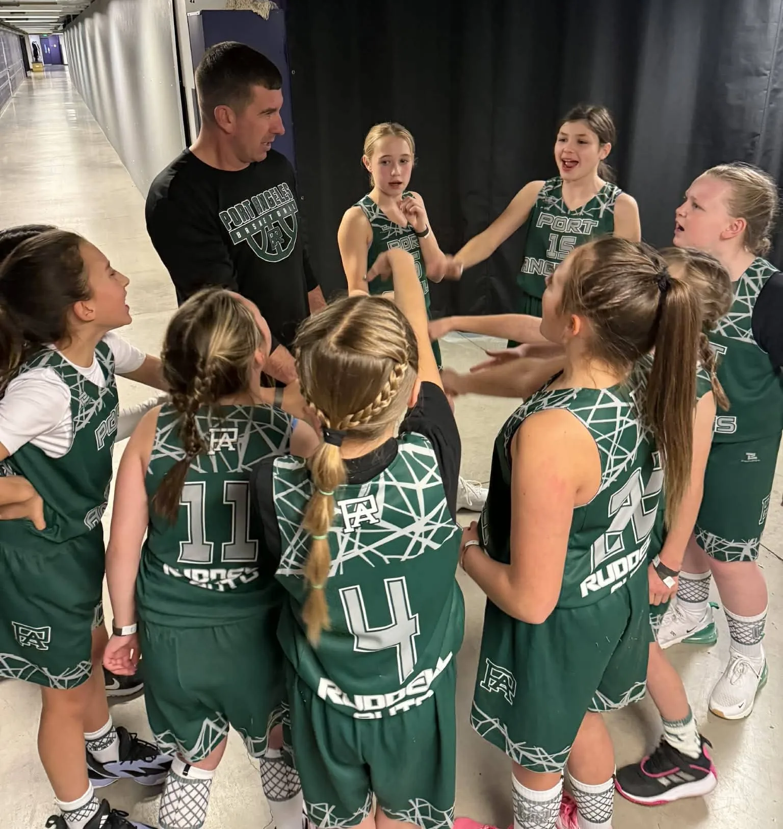 Former Port Angeles head coach Kasey Ulin’s fifth-grade girls basketball club team, shown here preparing to take the floor at the University of Washington, has qualified for the state tournament