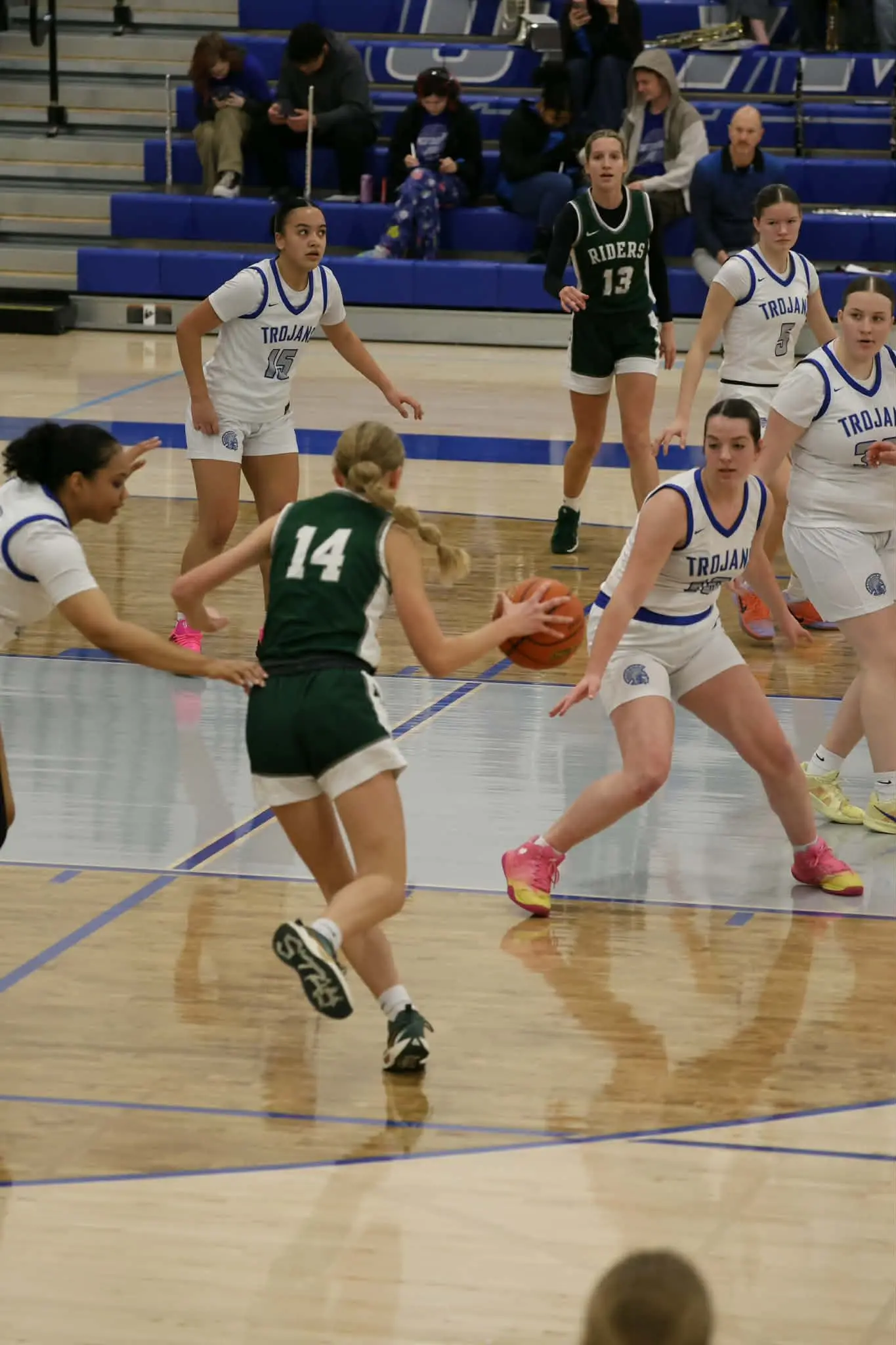 Roughriders guards #14 Storey Schmidt and #13 Morgan Politika look to attack the lane as Port Angeles tries to come away with a win against Bremerton tonight.