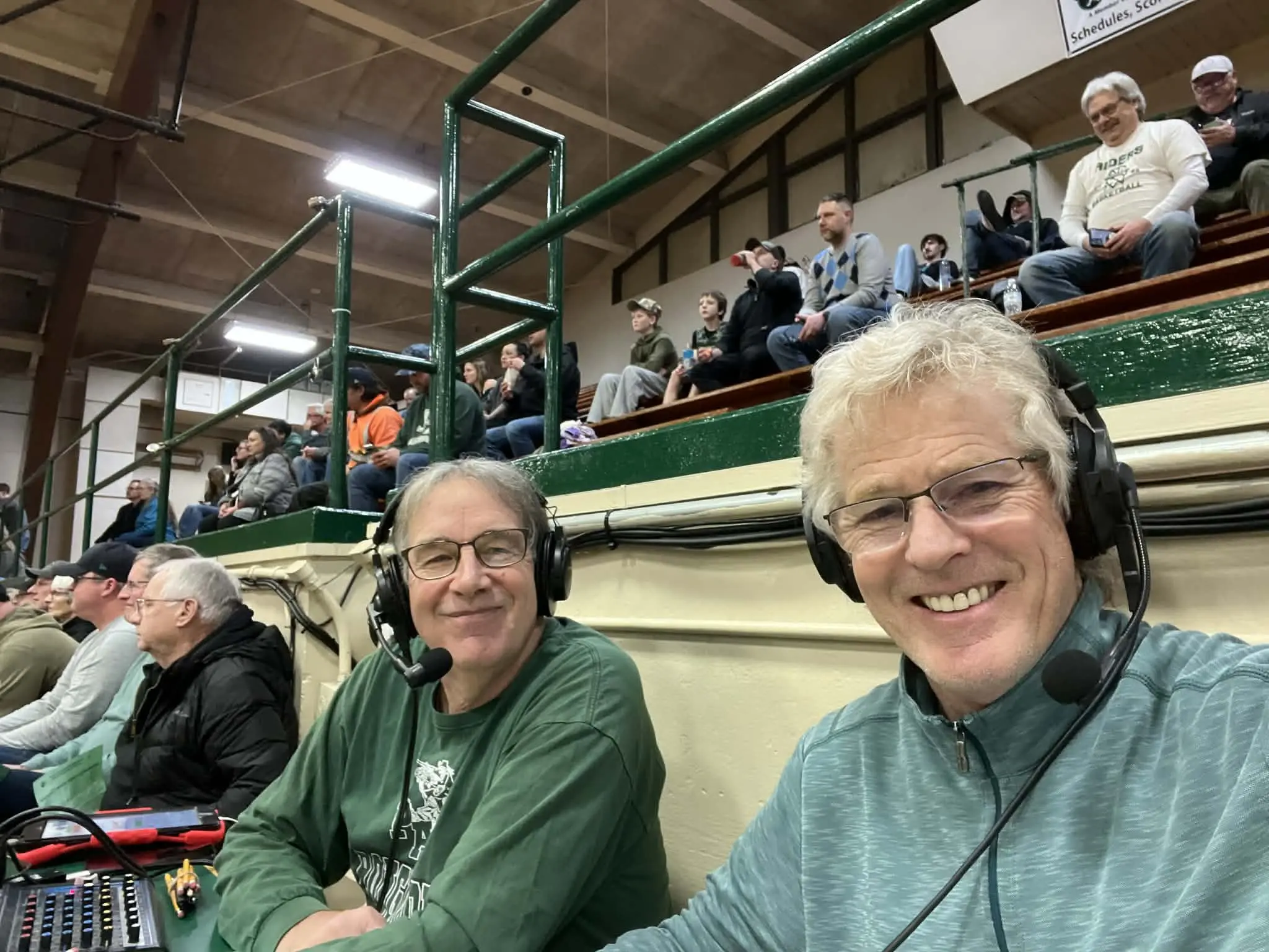 Greg Thomas (left) and Joe Gladfelter, who called last night’s Bremerton–Port Angeles game, will be on the call for tonight’s Peninsula men’s broadcast on KONP Newsradio.