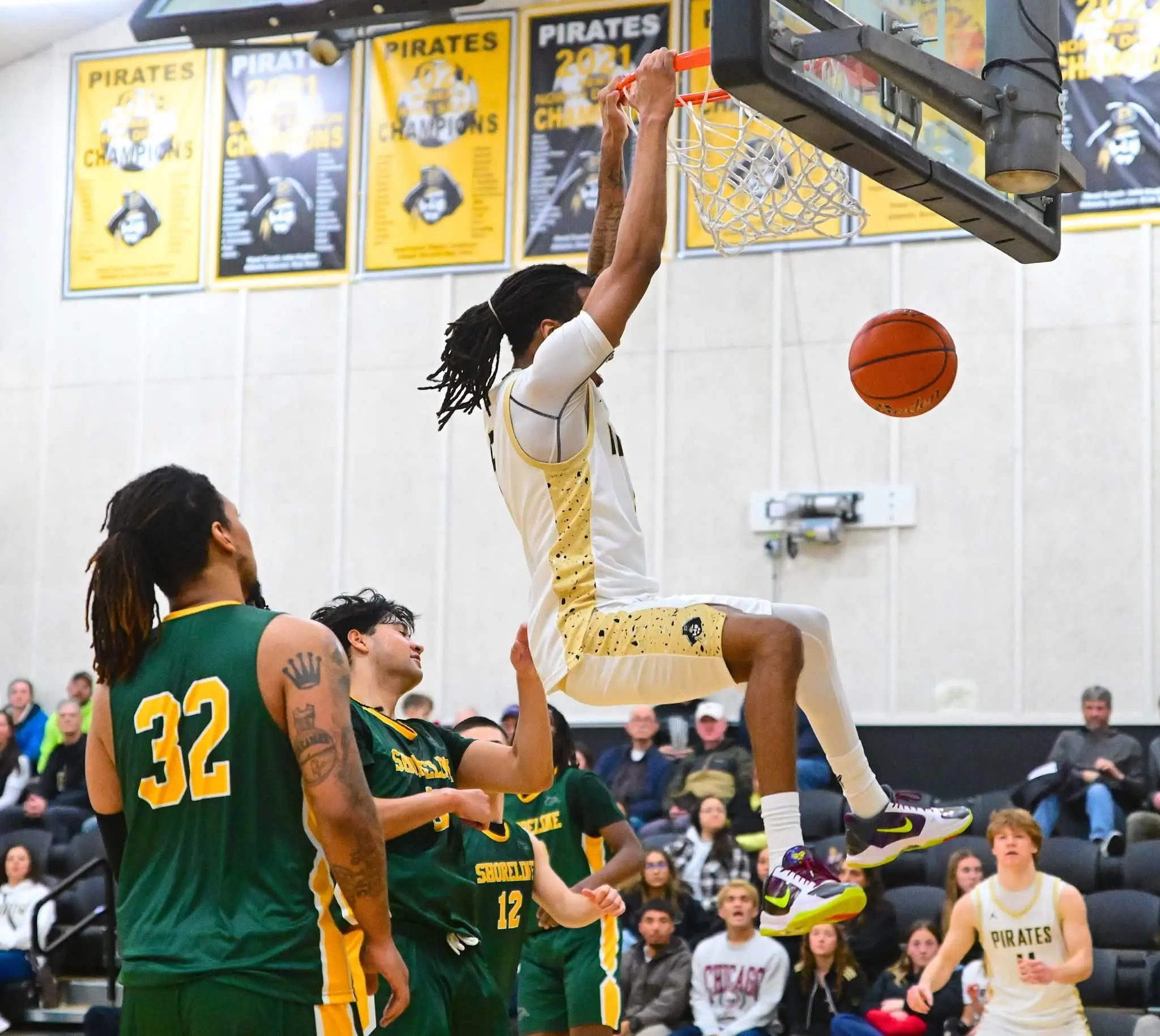 Pirates guard Cinco McNeal’s slam dunk helped keep Peninsula in NWAC playoff contention with a win over Shoreline. (Photo courtesty Jay Cline)