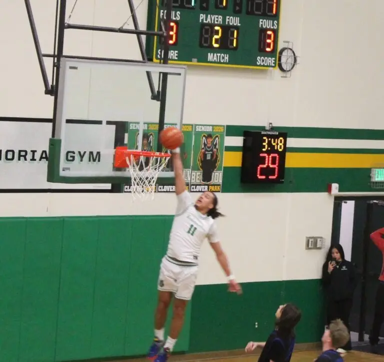 The Roughriders will look to slow down Clover Park’s 6-foot-2 senior point guard Marshall Scott, shown here dunking against Fife. Scott scored 26 points in the first half of that game.