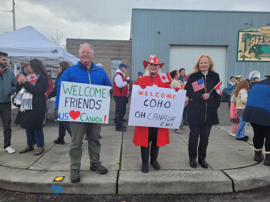 Port Angeles – Despite the cold, the mood was warm and festive Thursday afternoon at the Coho Ferry terminal where hundreds of people showed up with signs and banners welcoming the ferry and its Canadian passengers back to Port Angeles after the boat’s annual winter break.