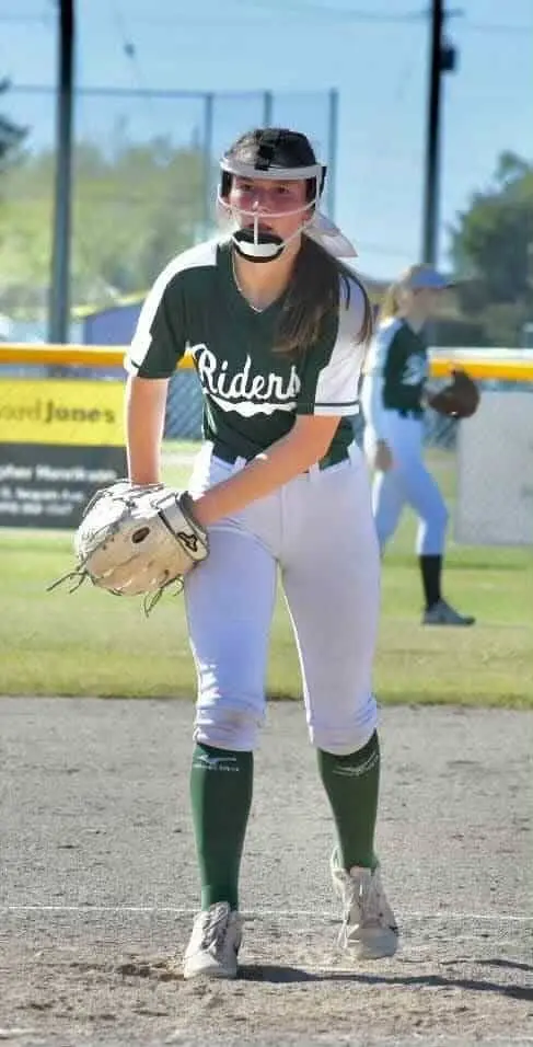 Port Angeles Roughrider senior pitcher and Lower Columbia College signee Lynzee Reid earned the win in a 15–0 five-inning season-opening blowout over Lynden.